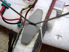 Der Fahrwerkeinbau (Steckung) ist im Prinzip gut realisiert, aber in der Praxis brechen die Kunststoffplatten im Rumpf nach ein paar harten Landungen auseinander. Mit einer 3 mm dicken PVC Hartschaumplatte 6 x 2,5 cm wurde eine Verstärkung (Bild rechts unten) mit UHU-POR aufgeklebt, die bis jetzt gehalten hat.