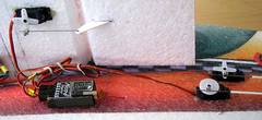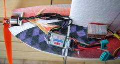 Der Antrieb wurde mit einem preiswerten Set (Motor 2212/13T, Regler 25 A) von GWS realisiert. Der Akku ist ein 3-Zellen 1300 mAh LiPo (108 g), damit deutlich schwerer als der empfohlene 800 mAh Akku, aber so ist die Flugzeit länger. Da der original Ausschnitt für den Akku im Rumpf unter dem Flügel zu klein war, wurde er vorne passend geschnitten. Um den richtigen Schwerpunkt einzustellen, musste der Akku quer eingebaut werden (Bild rechts oben).