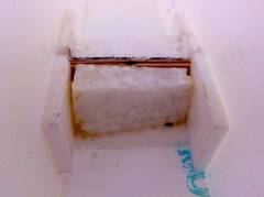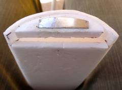 Die Haube sollte unsichtbar gehalten werden. Dazu habe ich vorne in die Haube ein Stück Depron 6 mm geklebt und darauf dann ein Stück Dosenblech (Eisen), siehe Bild rechts. In die Frontabdeckung wurde dann ein Neodym Magnet (5 x 6 x 1 mm) mit Beli-Zell (PU) geklebt, siehe Bild rechts.