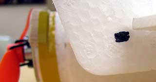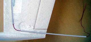 Für die Antenne habe ich die vorhandenen Rillen (gerade Strecken) mit einem Messer vertieft und weißes Kunststoffrohr 3,2 mm Aussendurchmesser eingeklebt. So kann man den Empfänger leichter wieder ausbauen. Das letzte Stück Kunststoffrohr habe ich soweit verlängert, dass der Antennendraht nicht mehr den Propeller berühren kann.