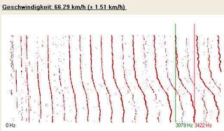 Dank des ausgezeichnetenProgrammes WAVEosSCOPE von www.sprut.de /Modellbau/Geschwingkeitsmessung, kann man von der Tonaufzeichnung vom Vorbeiflug über den Dopplereffekt die Geschwindigkeit messen. Das Programm und die Messmethode sind sehr gut in einer PDF Datei dokumentiert. Diagramm: Klick vergrößert.