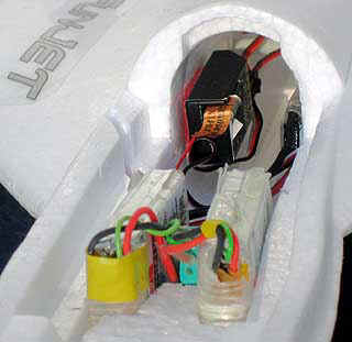 Der Empfänger ist ein Micro-6 digital von Conrad, mit Klettband an der rechten Innenwand des Rumpfes befestigt.. Als Servos wurden die preiswerten ES-05 von Conrad eingesetzt, die sehr gut in die vorgesehen Öffnungen im Flügel passen. Die Servokabel sind auch lang genug. Der Regler ist ein vorhandener BL-20 AIR von Conrad, wobei ab jetzt ein GWS Regler 25A sinnvoller (Preis, Gewicht) ist.