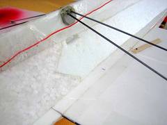 Die Verstärkung mit Balsaholz ist sehr wirksam. Das Prinzip der "elastic Flaps" ist auch sehr gut, wobei man da eine ruhige Hand am Messer haben muss. Das Bild rechts oben zeigt Querruder und Seitenruder Servo.