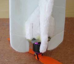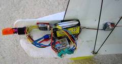Als Motor wurde der preiswerte Hextronic C2028/20 mit GWS 7 x 3,5" Propeller verwendet. Mit einem 3 Zellen LiPo Akku reicht der Schub zum senkrecht fliegen. Die Komponenten Akku, Regler und Empfänger wurde alle mit Klettband befestigt, siehe Bild rechts. Mit der Position des Akkus kann man dann noch den Schwerpunkt etwas justieren.