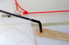 Als Anlenkungsschnur habe ich rote, geflochtene Maurerschnur (1 m = 0,4 g) aus dem Baumarkt genommen. Die Idee mit dem gebogenen Bowdenzugröhrchen (3,2 mm Außendurchmesser) ist auch sehr gut. Man muss aber ein Heißluftgebläse haben, um die Biegung zu bekommen, damit der Festpunkt (Schnuraustritt am Röhrchen) in die Ruderachse kommt. Damit die Ruderausschläge nicht zu groß werden, sollte das Bowdenzurohr an Länge mindestens Abstand Servohorn Bohrungen mal 1,4 haben (zum Beispiel 24 -> 34mm). Durch das biegen gehen schon ein paar Millimeter verloren, siehe Bild rechts unten. Da die Seitenruderanlenkung nicht klar ersichtlich war, hatte ich sie zuerst nach unten gesetzt. Das hat sich aber nicht bewährt, da dort das Seitenruder nicht den "elastic Flap" Anschluss hat. Oben ist die Anbringung besser.