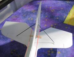 An weiteren Verbesserungen wurde noch das Heck verstrebt und bessere Servos eingebaut. Die billigen 3,7g Servos von www.unitedhobbies.com hatten doch sehr grobe Raststufen, was sich auch bei der Mittenstellung bemerkbar machte.