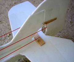 Der Kohlefaserstab selbst wird dann am besten mit Heißkleber (schnell) oder mit 5-Minuten UHU-plus (langsamer) beidseitig angeklebt. Dabei sollten die Tragflächen gerade ausgerichtet sein. Heißkleber bietet den Vorteil, dass man noch nachträglich korrigieren kann.