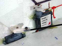 Die Servos EM 4,3 g von www.unitedhobbies.com haben eine Eigenart, die das Trimmen etwas erschwert. Nach jeder Seite werden nur circa 25 Stufen gefahren, zusammen etwa 50. Dafür sind sie mit 2,70 EUR (ohne Porto) sehr preiswert und schnell.