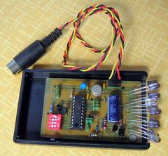 Damit das ganze nachbaufreundlich ist, habe ich eine Platine (8 x 5 cm) dazu mit Eagle entworfen. Voraussetzung ist, dass der Fernsteuer-Sender eine Lehrer Buchse hat, so daß man die PPM-Impulse und die Akkuspannung (9,6 V) bequem anzapfen kann. Bei meinem Graupner MC12 Sender war die Lehrer Buchse vorhanden, aber die geschaltete Versorgungsspannung musste über eine extra Niederspannungsbuchse herausgeholt werden.