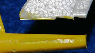 Um den Schwerpunkt mit minimalem Zusatzgewicht zu verbessern, habe ich eine neue Rumpfnase aus EPP ausgeschnitten und angepasst. Die neue Nase muss hinten soweit ausgehölt werden, dass der Akku wie im Bild rechts Platz findet. Das Bild (Klick vergrößert) zeigt nur die Lage des Akkus, er muss natürlich zum Schutz im Inneren der Nase stecken! Dazu muss der vorne auseinandergespreizte Rumpf mit dem Akkuprofil ausgeschnitten werden. Dann löst man vorsichtig den Akku (doppelseitiges Klebeband) vom Rumpf und zieht ihn nach vorne. Die Kabellänge ist ausreichend.