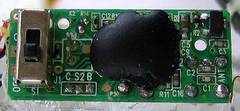 Zur Beschaltung muss man zuerst die eventuell vorhandene Lötbrücke an SW5 (rechts neben dem Microprozessor) nach B oder C entfernen. Der mittlere Schalteranschluss wird an den mittleren Lötpin von SW5 angelötet (im Bild roter Draht). Der linke Schalteranschluss kommt an Lötpin C (im Bild blauer Draht) und der rechte an B (im Bild gelber Draht). Die Schaltstellungen sind dann: Kanal B-A-C. Es kann bei eingeschaltetem Sender umgeschaltet werden.