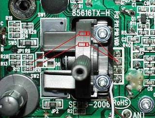 Bereits im Originalzustand fehlen dem Sender die 2 Dioden (siehe die vier nicht bestückten Lötpunkte in dem roten Rahmen, im Bild rechts), die die Seitenauslenkung verringern. Damit sind die Kurven enge genug, um auf einer begrenzten Fläche vernünftig zu manöverieren. Die beiden Schrauben im Bild befestigen den Seitenknüppel.